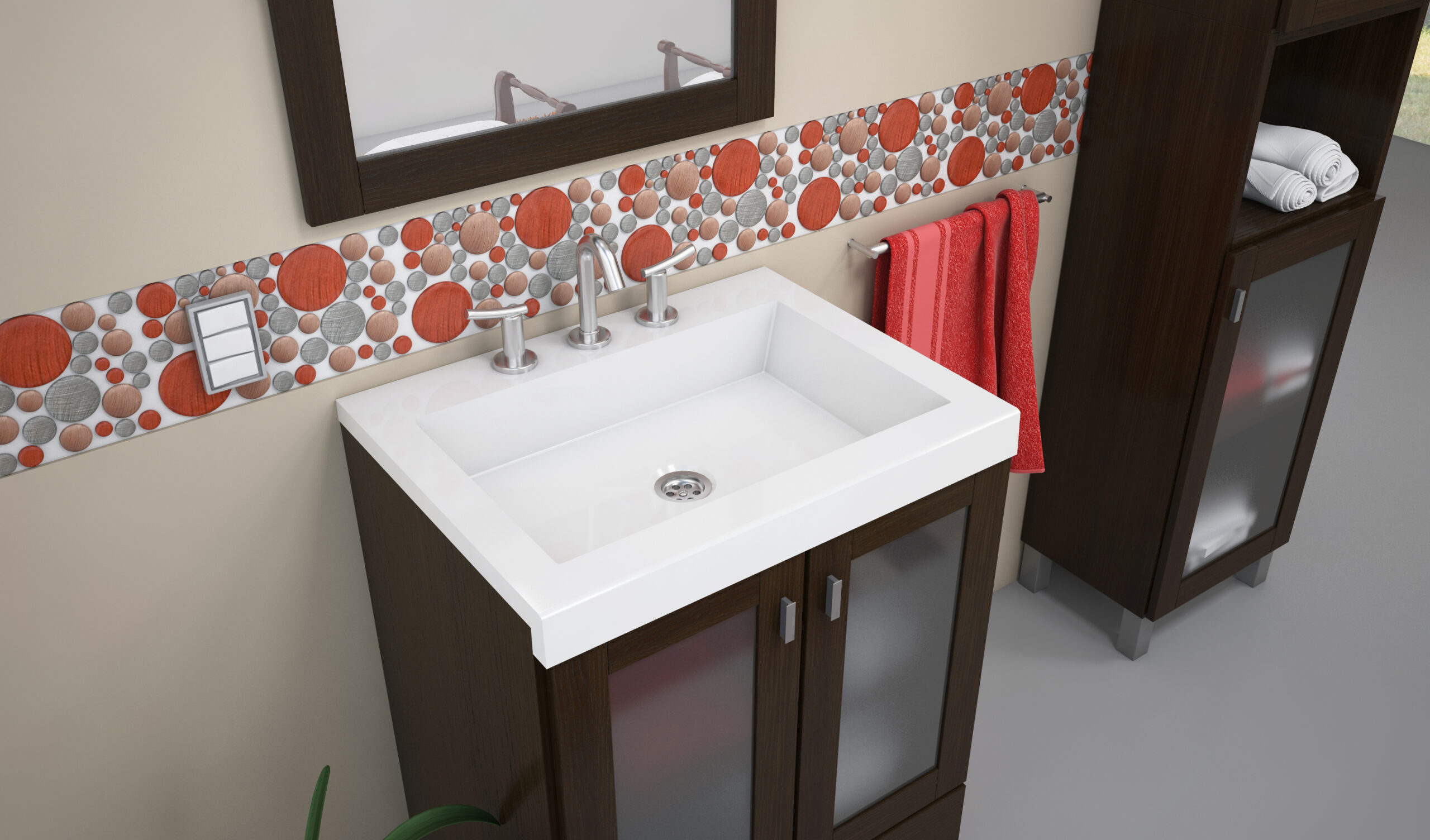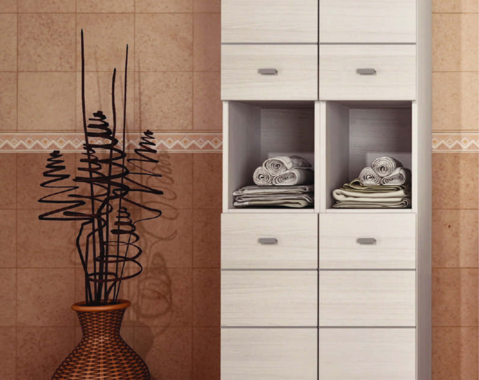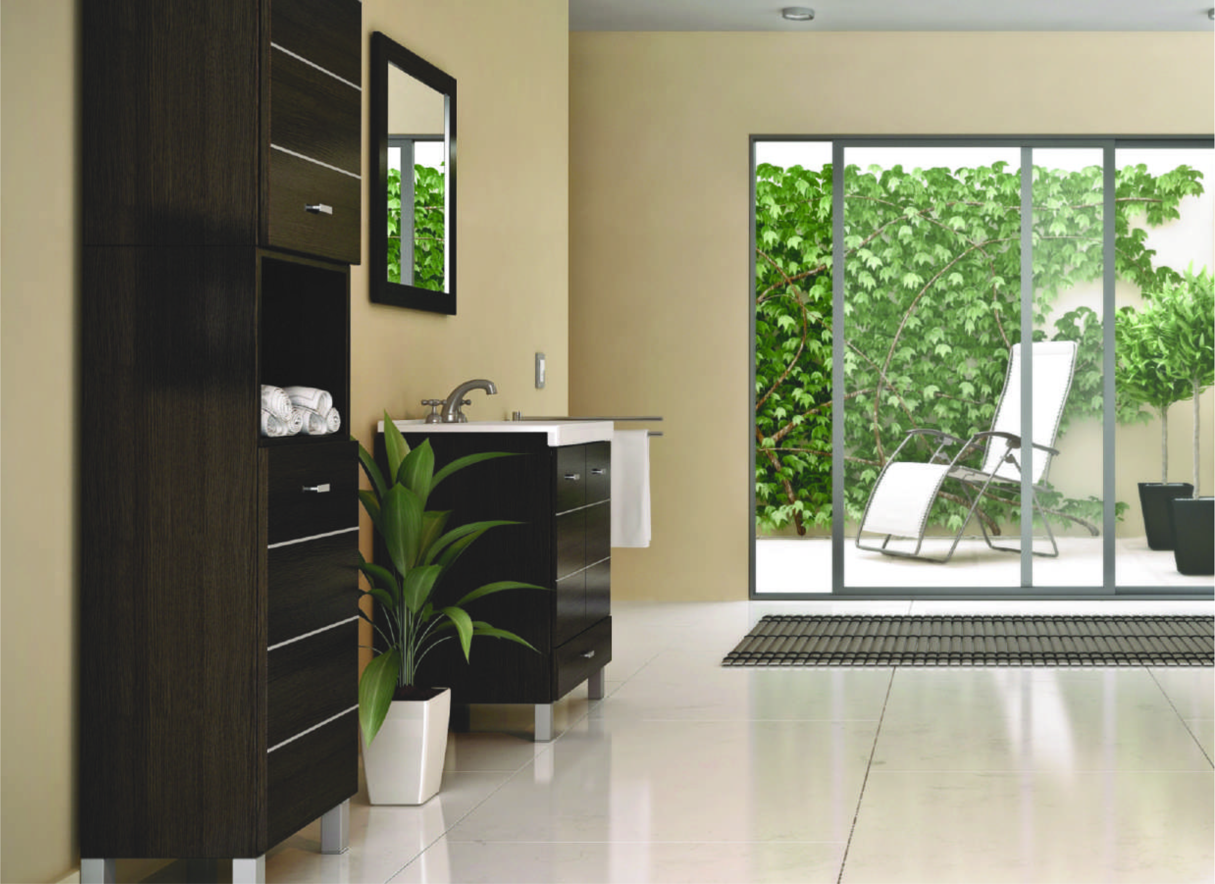 Terra Matrix es un mueble para baño de melamina disponible en versiones de pie (con puertas y un cajón) y colgante (con puertas, sin cajón) que también cuenta con un armario de pie y sobre armario.