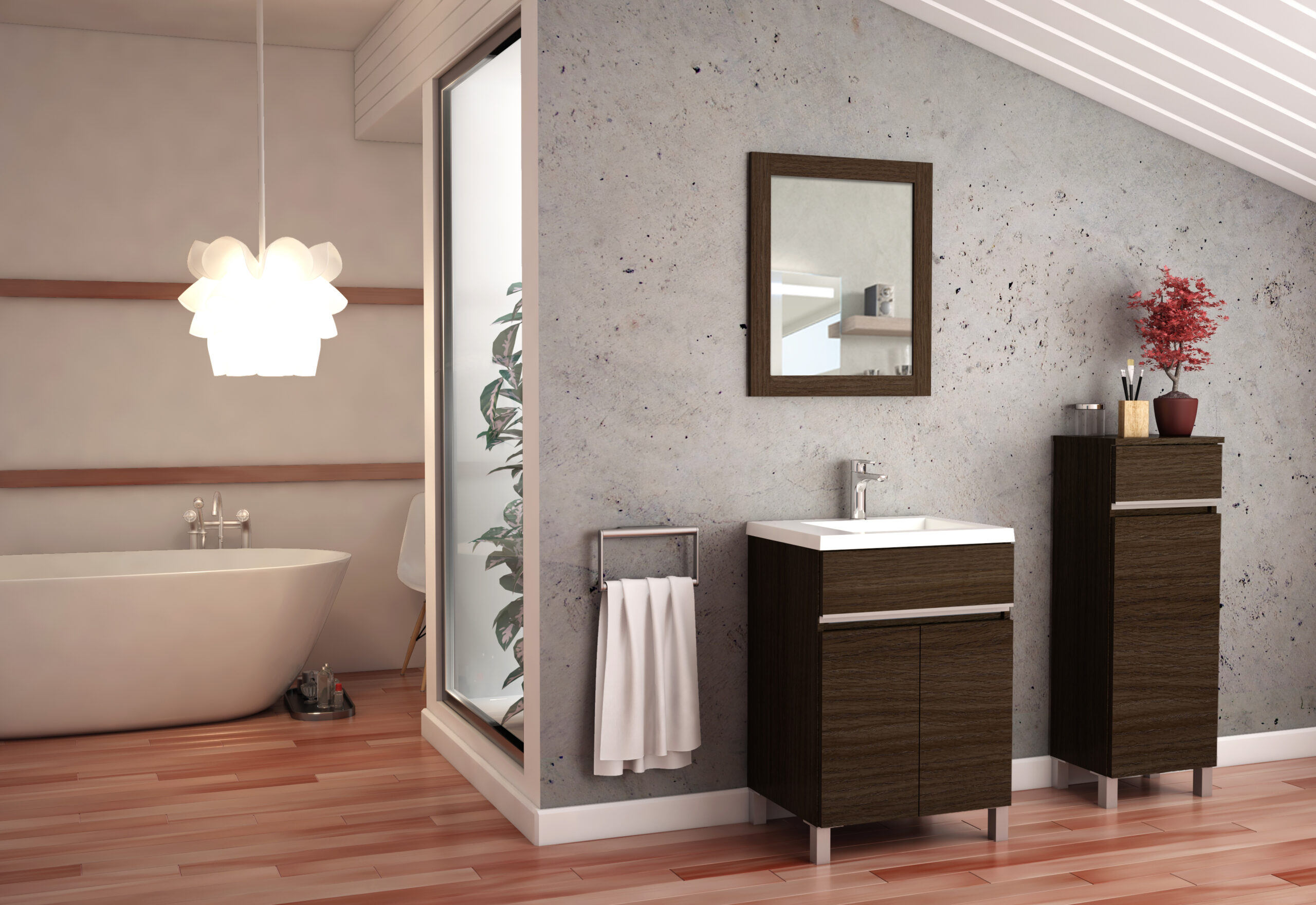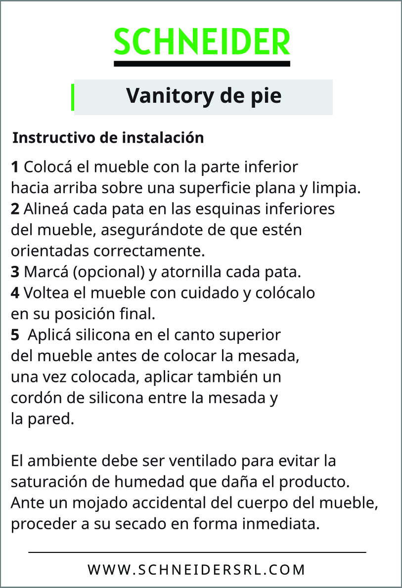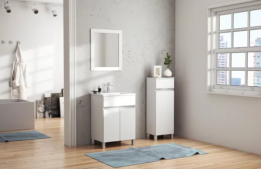 Vera es un mueble para baño de pie (dos puertas) que también cuenta con un armario de pie. Está disponible en melamina o también recubierto con una capa de PVC, lo que asegura funcionalidad y diseño.
